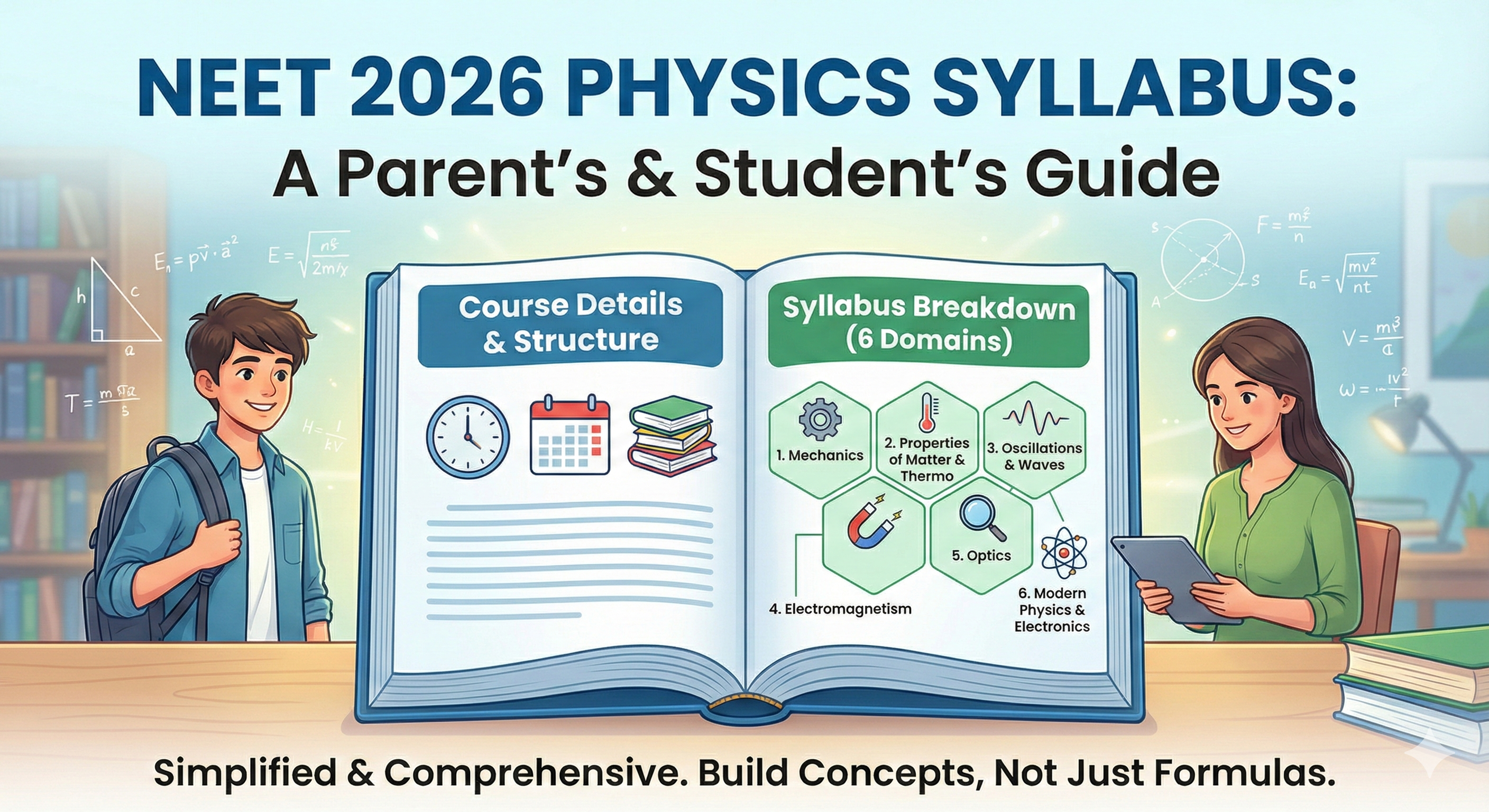 Overview for Parents & Aspirants: Physics in NEET is not just about memorizing formulas; it is about understanding how the universe works—from the smallest atoms to the movement of planets. This syllabus covers the complete 2-year curriculum (Class 11 and 12), categorized here into six core domains to help you visualize the scope of study.